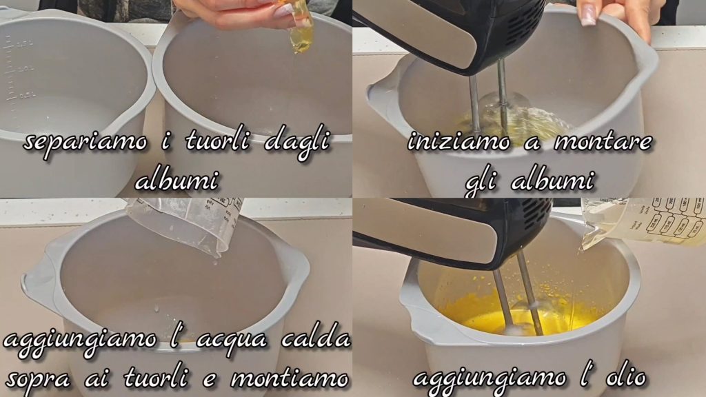 Tout d’abord, séparons les jaunes des blancs d’œufs. Commençons à monter les blancs en neige avec les fouets. Mettez l’eau chaude sur les jaunes et montez-les également. Ajoutez l’huile,