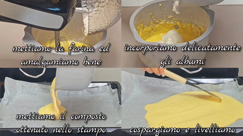 Ajoutez la farine et mélangez. Incorporez les blancs montés en neige petit à petit avec des mouvements délicats. Mettez le mélange obtenu dans le moule avec du papier sulfurisé à l’intérieur. Saupoudrez et nivelez.
