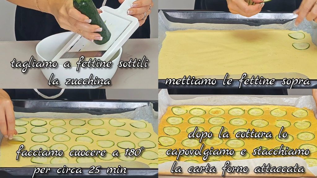 Coupez la courgette en fines tranches et placez-les dessus. Faites cuire à 180° pendant environ 25 minutes. Après la cuisson, retournez-le et retirez le papier sulfurisé attaché.