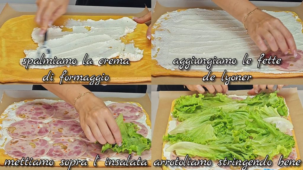 Étalez la crème de fromage dessus. Ajoutez les tranches de lyoner, la salade et roulez en serrant bien. Mettez au réfrigérateur pendant quelques heures.
