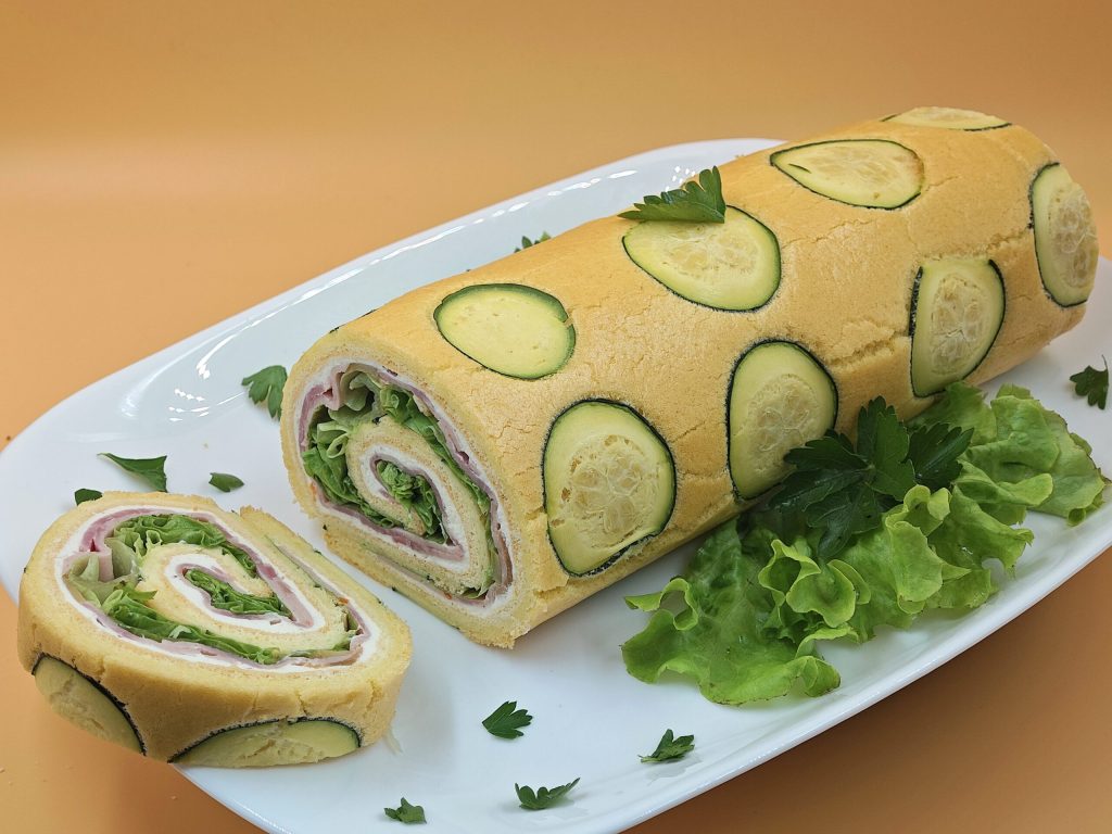 Un roulé fait avec une génoise salée très moelleuse et enrichie de fines tranches de courgettes, puis garni de salade, fromage à tartiner et de lyoner. C’est très frais, spectaculaire et simple à préparer, parfait à servir comme apéritif lors de ces soirées d’été. Cet été, je me suis passionnée pour les roulés, j’en ai fait de tous types, de ceux aux légumes à ceux à la mozzarella sans cuisson, etc.