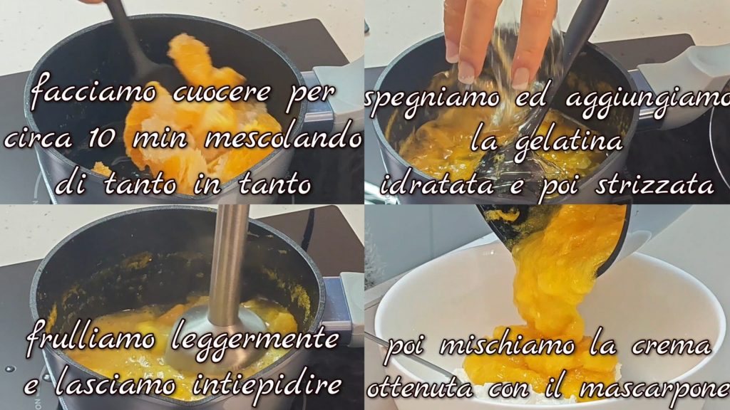 faites cuire environ 10 minutes en remuant de temps en temps. Éteignez et ajoutez la gélatine préalablement hydratée puis essorée. Mixez légèrement avec un mixeur plongeant et laissez tiédir, puis mélangez la crème obtenue avec le mascarpone.