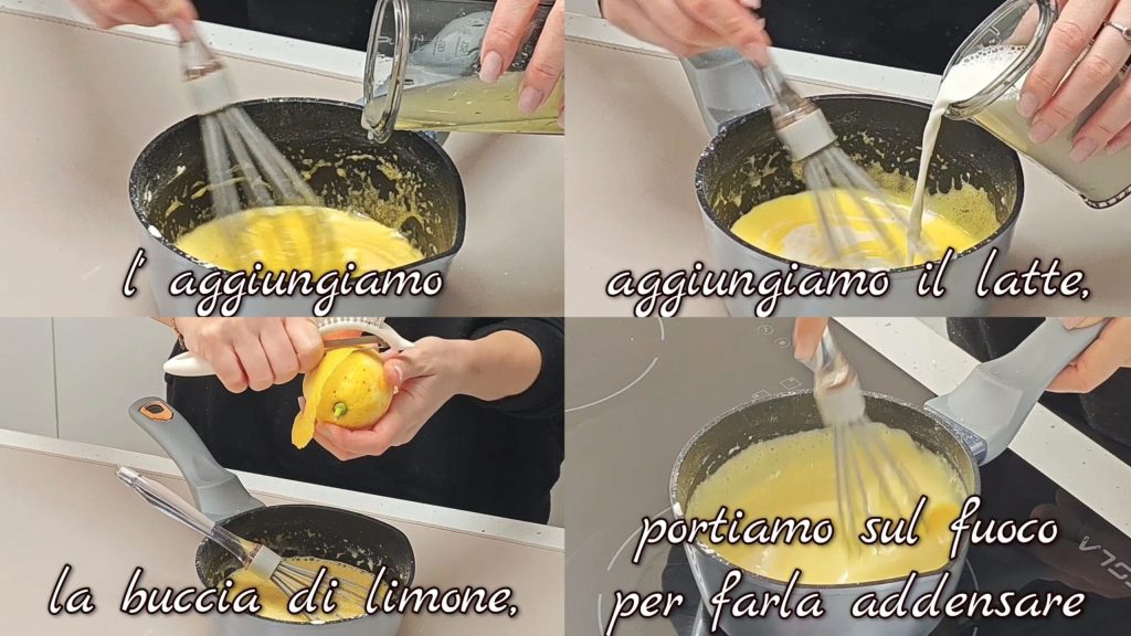 ajoutez-le. Ajoutez le lait, le zeste de citron et portez sur le feu pour épaissir en remuant toujours pour ne pas qu’il colle.