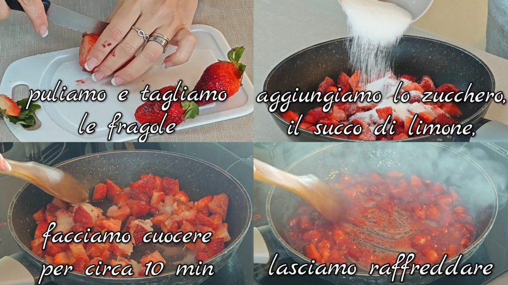 Nettoyons et coupons les fraises, ajoutons le sucre, le jus de citron et faisons cuire pendant environ 10 min en remuant de temps en temps. Laissons refroidir.