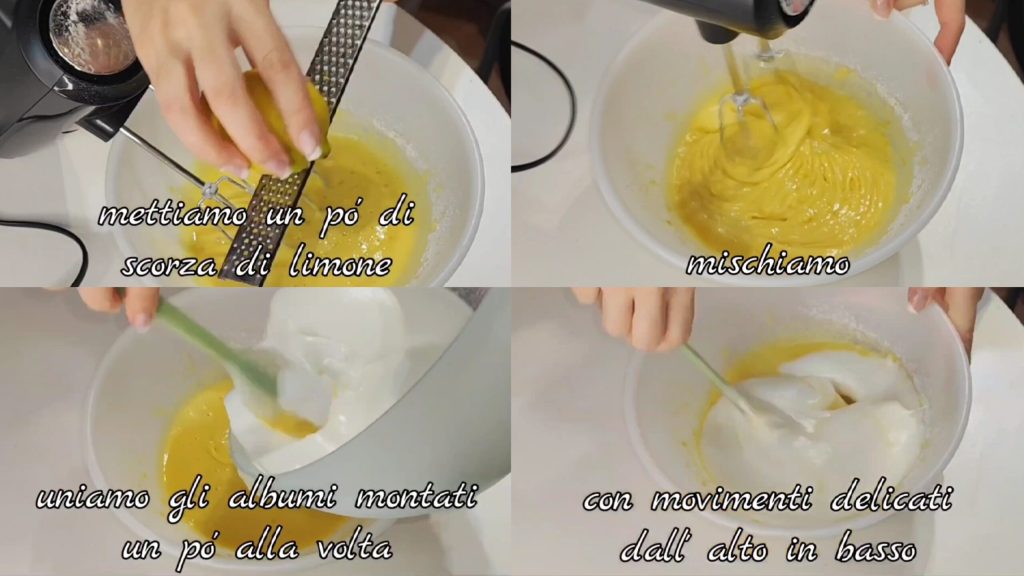 un peu de vanille, zeste de citron et mélangeons. Incorporons délicatement les blancs montés.