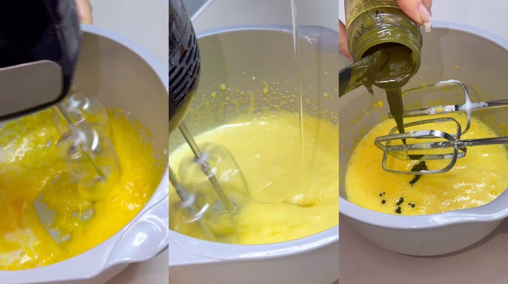 Ajouter l’huile et la pâte de pistache, bien mélanger.