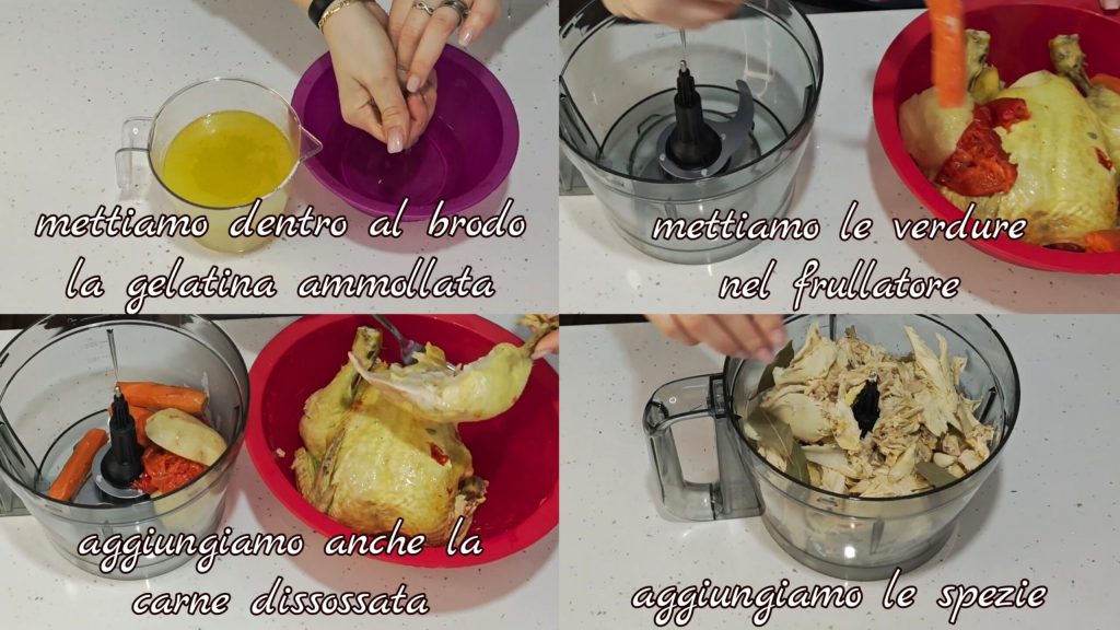 Mettons dans le bouillon chaud la gélatine préalablement trempée dans l’eau froide. Mettons les légumes dans le mixeur, ajoutons également la viande désossée, ajoutons les épices,