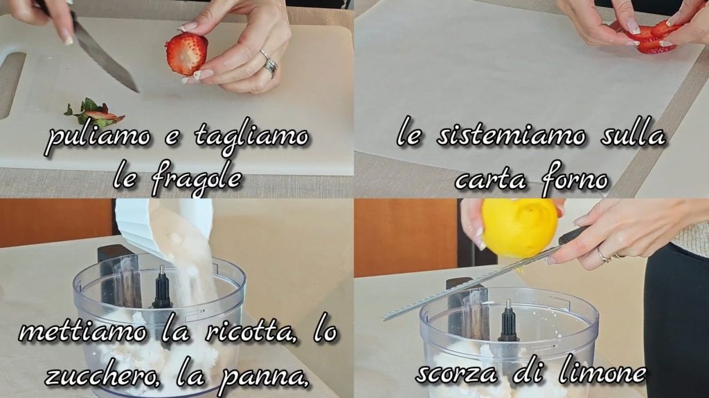 Tout d’abord, nettoyons et coupons les fraises en tranches puis plaçons-les sur une feuille de papier sulfurisé. Mettons la ricotta, le sucre, la crème, le zeste de citron