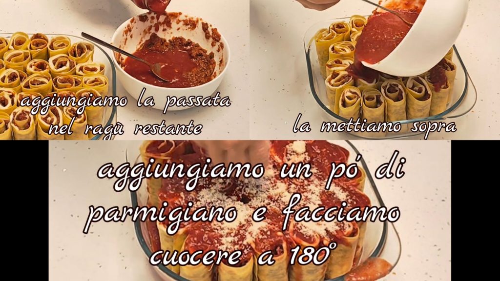 Une fois tous les rouleaux terminés, ajoutez un peu de coulis de tomate au ragoût restant et versez-le sur les rouleaux. Ajoutez un peu de parmesan râpé et faites cuire à 180° pendant environ 40 min.
