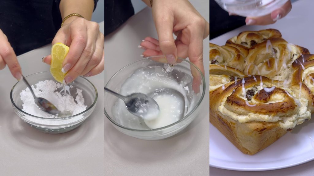 • Mélangez le sucre glace et le jus de citron jusqu’à obtenir un glaçage lisse. Appliquez-le sur les roulés à la cannelle encore tièdes. Pour un résultat encore plus moelleux, utilisez de la ricotta bien égouttée et ne surdosez pas l’humidité de la garniture