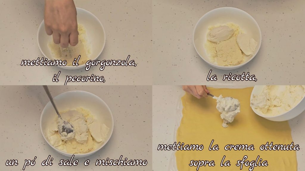 Dans un récipient, mettez le gorgonzola, le pecorino râpé, la ricotta, un peu de sel et mélangez. Étalez la crème obtenue sur la pâte feuilletée,