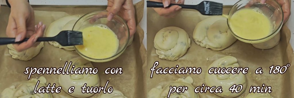 Badigeonnez-les avec un peu de lait et de jaune d’œuf dessus. Faites cuire à 180° pendant environ 40 minutes.