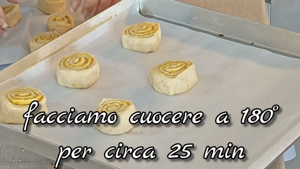 Répartissez uniformément la garniture sur les couches de pâte et roulez délicatement du côté le plus long, formant un cylindre. Coupez en tranches d’environ 2-3 cm d’épaisseur et disposez les roulés sur une plaque tapissée de papier sulfurisé.