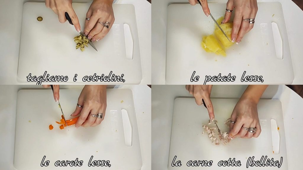 Nous commençons la préparation en coupant en petits dés les cornichons au vinaigre, les pommes de terre cuites, les carottes cuites, la viande cuite (bouillie) et nous les mettons tous ensemble dans un grand récipient.