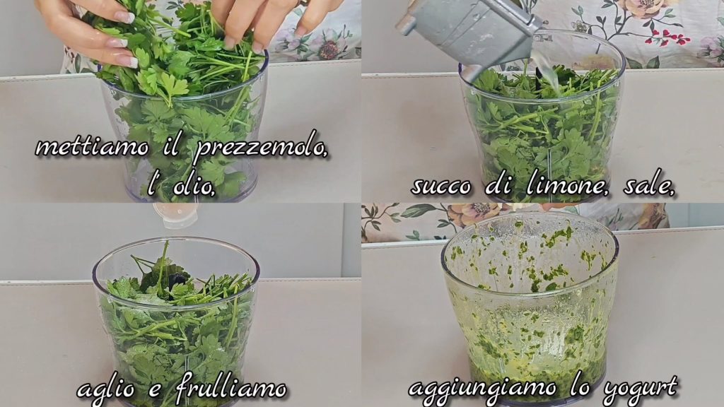 • Dans un mixeur, nous mettons le persil, l’huile, le jus de citron pressé, le sel, l’ail et nous mixons. Nous ajoutons le yaourt