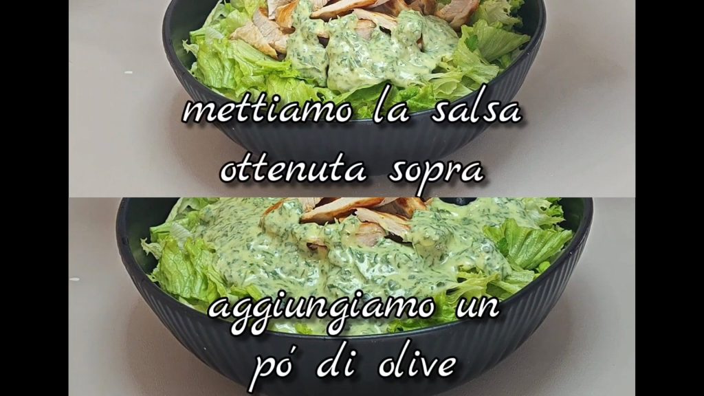 • mélangeons bien. Nous mettons la sauce obtenue sur la salade. Nous ajoutons quelques olives noires.