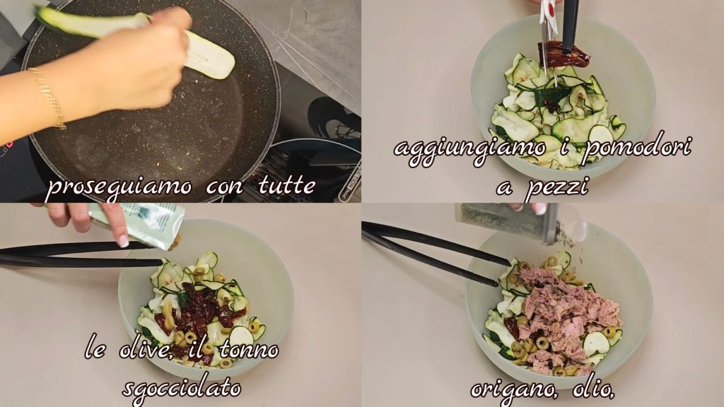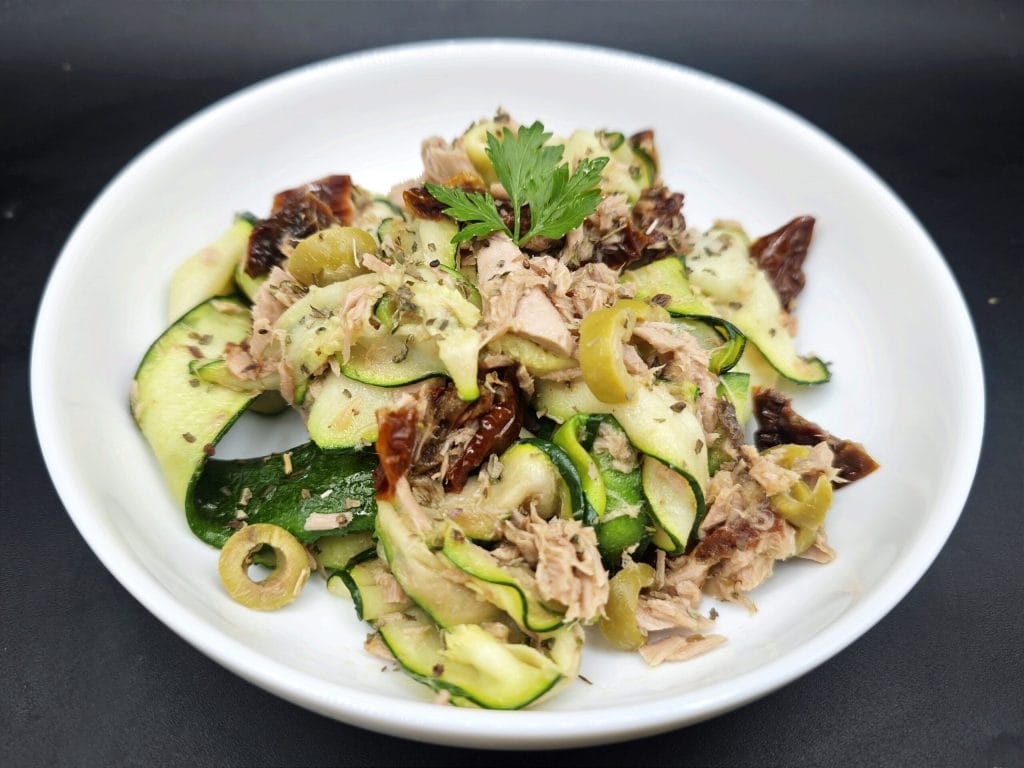 Une recette estivale préparée comme une salade en réunissant les courgettes à peine grillées avec le thon, les olives, les tomates à l’huile et diverses épices. Il va de soi que l’on peut enrichir ou modifier en retirant ou ajoutant d’autres ingrédients selon son goût. Une excellente idée si vous souhaitez un repas léger ou quelque chose de frais ! Une recette très simple qui se prépare en quelques minutes.