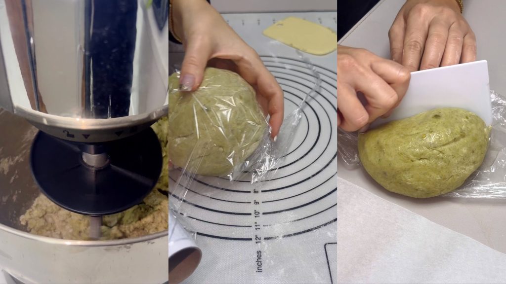 Enveloppez dans un film plastique et laissez reposer au réfrigérateur 30 minutes. Après environ 30 min, divisez la pâte en deux parties égales.