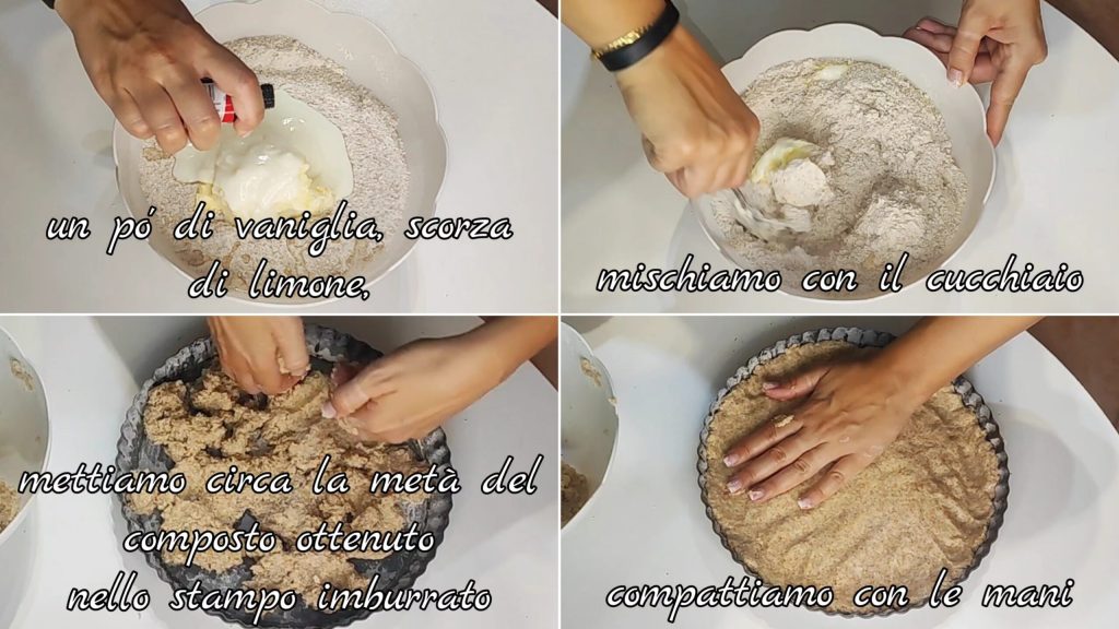 • Ajoutons un peu de vanille et de zeste de citron. Mélangeons et amalgamons bien à l’aide d’une cuillère. Mettons la moitié de la pâte obtenue dans un moule beurré et compactons-la avec les mains en faisant également le bord.
