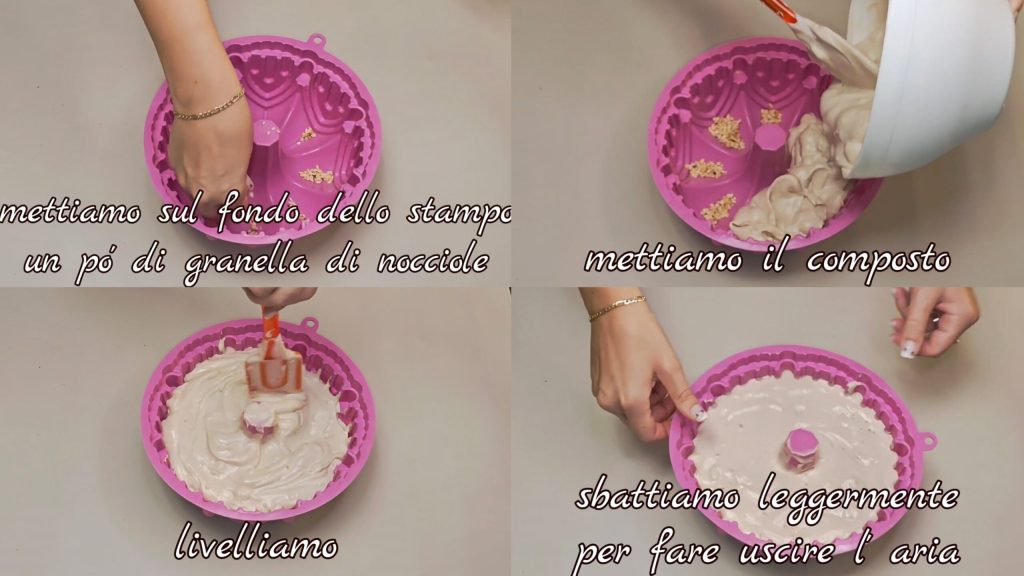 Mettez au fond du moule un peu de noisettes concassées. Ajoutez la crème obtenue et nivelez. Tapotez légèrement pour faire sortir l’air.