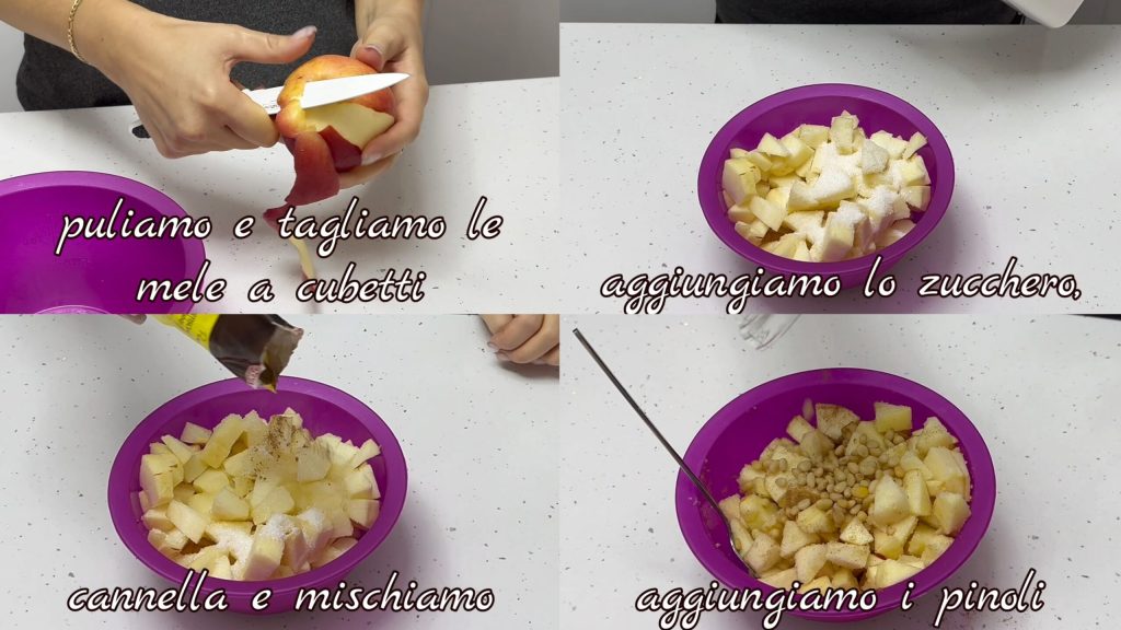 Tout d’abord, nous devons éplucher, nettoyer et couper les pommes en dés. Ajoutez le sucre, la cannelle et mélangez. Enfin, ajoutez également les pignons.