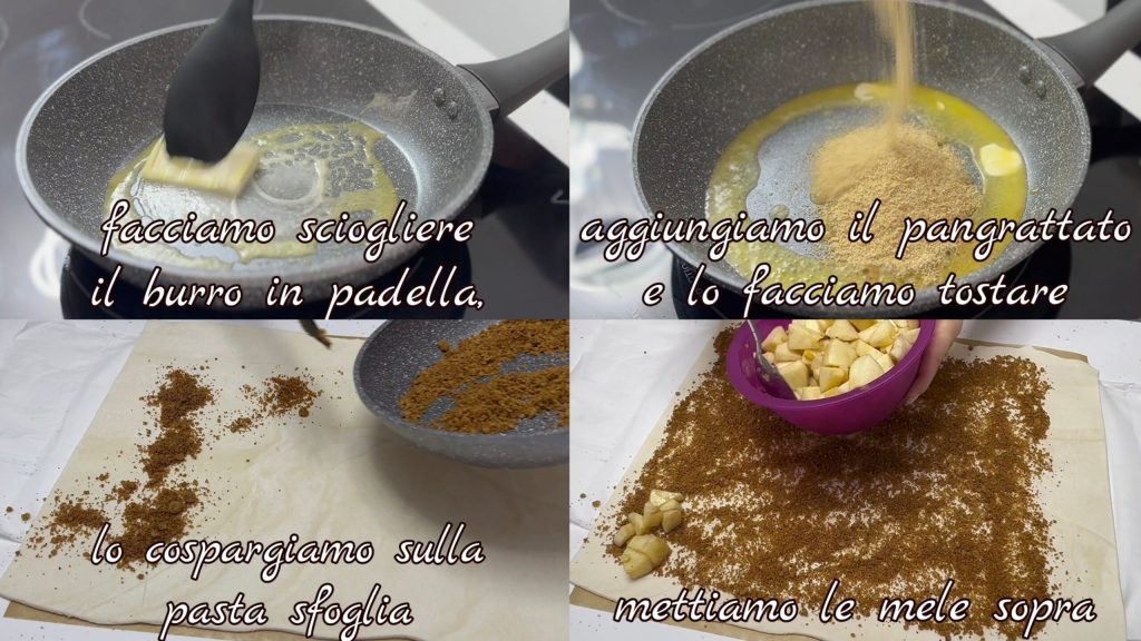 Dans une casserole, faites fondre le beurre. Ajoutez la chapelure et faites-la griller. Pendant ce temps, ouvrez la pâte feuilletée et étalez la chapelure grillée sur toute la surface. Disposez les pommes dessus en laissant la partie finale vide.
