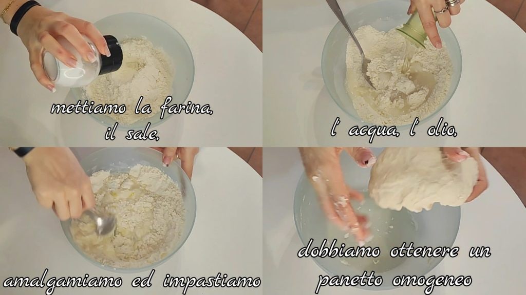 Dans un récipient, mettez la farine, le sel, l’eau, l’huile, puis mélangez et pétrissez jusqu’à obtenir une pâte homogène.