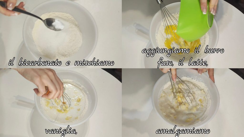 Ajoutons le bicarbonate et mélangeons. Ajoutons le beurre fondu, le lait, la vanille et mélangeons.