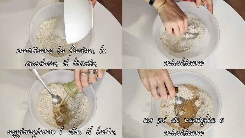 Dans un récipient, mettez la farine, le sucre, la levure et mélangez. Ajoutez l’huile, le lait, un peu de vanille et mélangez.