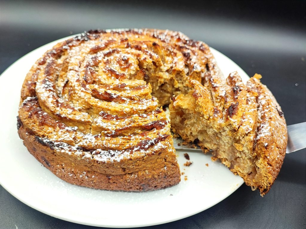 Une délicieuse tarte végane faite sans œufs, lait ni beurre et utilisant de la farine intégrale puis garnie d’une compote de pommes et façonnée en forme de spirale. Eh bien, vous avez sûrement remarqué que j’aime beaucoup les spirales de toute sorte, du gâteau roulé aux versions salées ! Un dessert très simple à réaliser et parfait pour bien commencer la journée accompagné d’une tasse de thé ou de café ! Évidemment, si vous souhaitez remplacer la farine intégrale pour diverses raisons, vous pouvez le faire en utilisant environ 120 % de farine blanche. De même, à la place des pommes, vous pouvez utiliser n’importe quel type de confiture ou de pâte à tartiner à votre goût !
