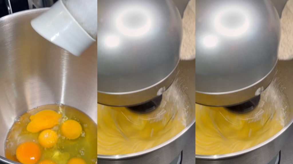 Montez les œufs dans un saladier avec une pincée de sucre et une pincée de sel jusqu’à obtenir un mélange clair et mousseux. Ajoutez la farine et la fécule