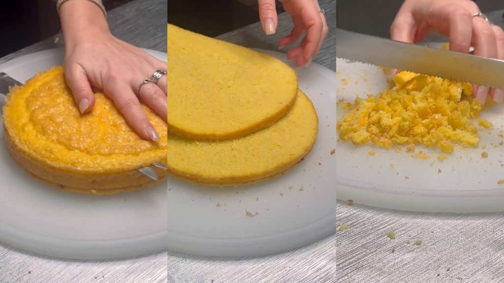 Laissez refroidir complètement, puis coupez le gâteau en trois disques égaux. L’un d’eux, coupez-le en dés pour la décoration mimosa.