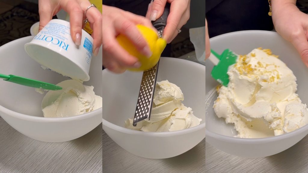 Dans un bol, mélangez la ricotta, le fromage à tartiner, le zeste de citron et le sel. Si besoin, ajoutez un peu de lait pour assouplir la crème.