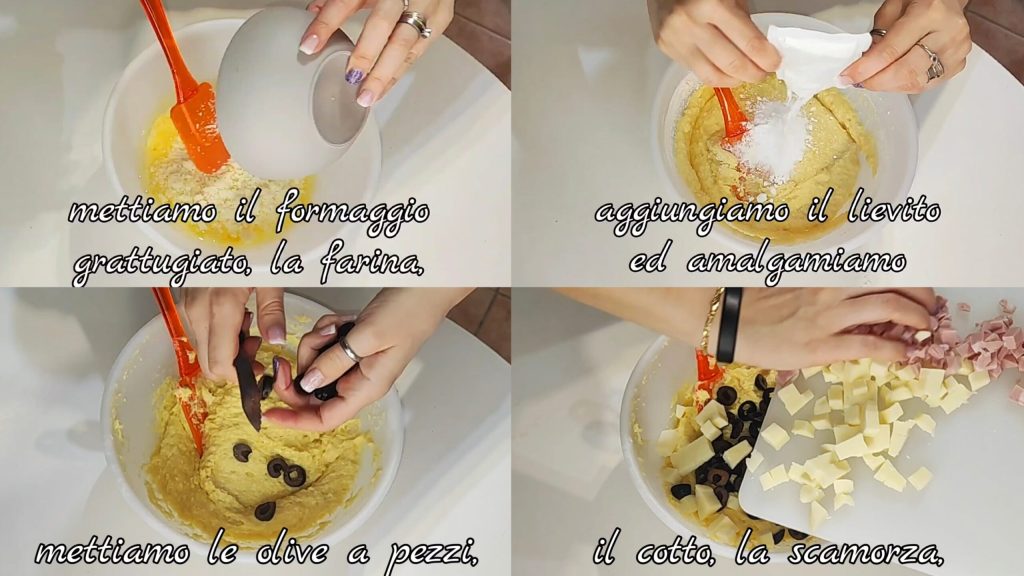Ajoutons le fromage râpé, la farine, la levure et mélangeons à nouveau. Enfin, ajoutons les olives coupées à votre goût, le jambon cuit et la scamorza également coupés.