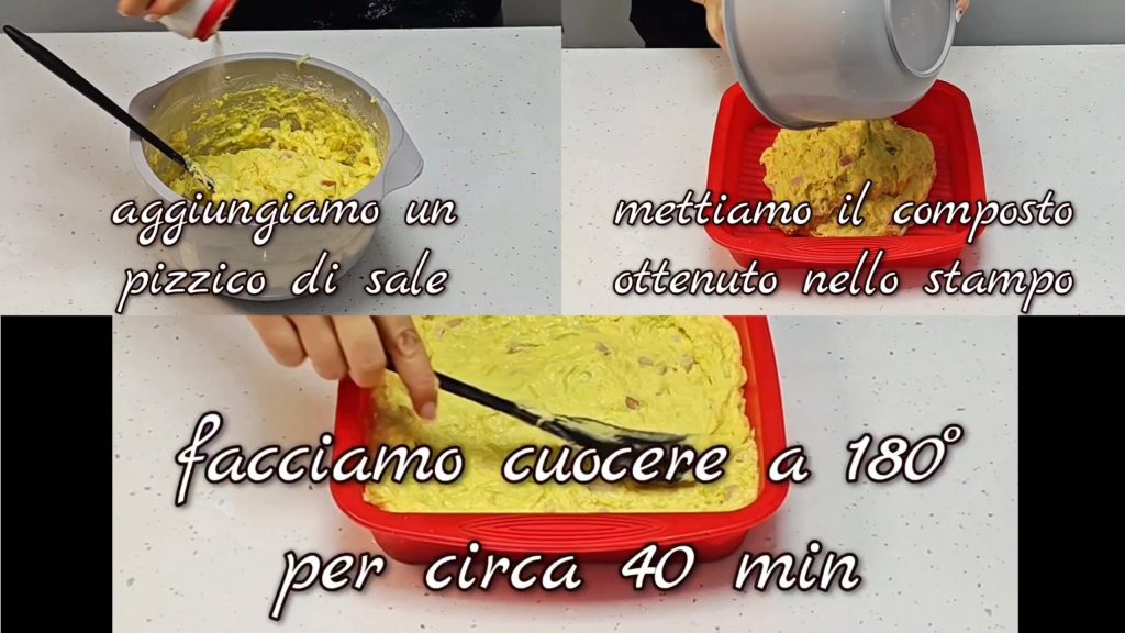 • nous mettons une pincée de sel et mettons le mélange obtenu dans le moule. Nous faisons cuire à 180° pendant environ 40 minutes.