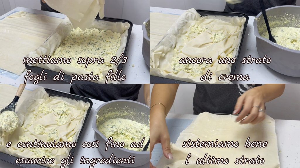 puis 3/4 autres feuilles et continuons ainsi en alternant les couches jusqu’à épuisement des ingrédients. Arrangeons bien la dernière couche de pâte filo