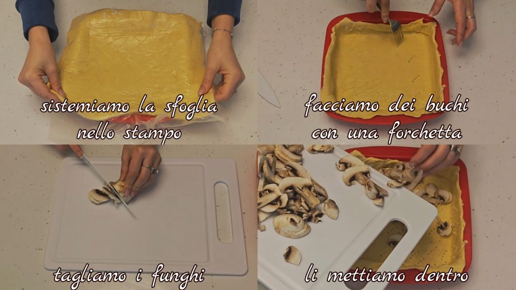 Tout d’abord, nous plaçons la pâte feuilletée dans le moule et faisons des trous avec une fourchette. Nous coupons les champignons en fines tranches et les mettons à l’intérieur.