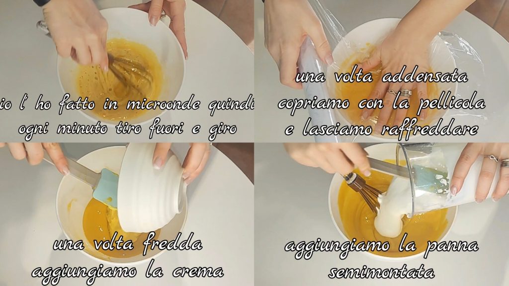Je l’ai fait au micro-ondes donc chaque minute je m’arrête et je sors pour remuer. Une fois la crème épaissie, nous la couvrons avec du film plastique et laissons refroidir. Après qu’elle ait bien refroidi, nous l’ajoutons à la crème pâtissière, ajoutons la crème semi-fouettée.