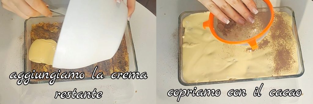 nous ajoutons la crème restante, nous couvrons avec du cacao et nous mettons au réfrigérateur pour quelques heures.