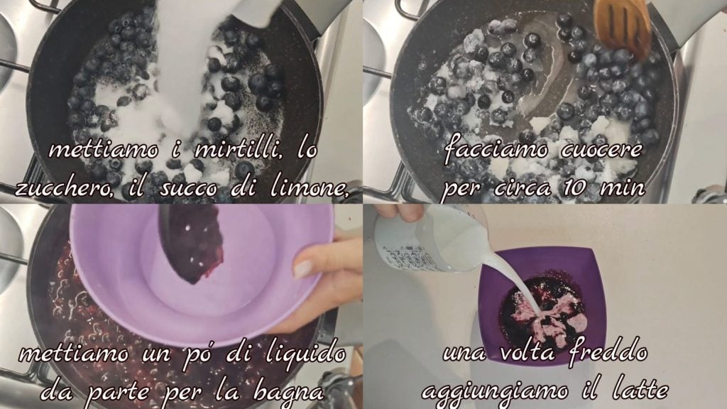 Dans une casserole, mettez les myrtilles, le sucre, le jus de citron et faites cuire pendant environ 10 minutes. Réservez un peu du jus libéré car il nous servira pour tremper les biscuits. Une fois le jus refroidi, ajoutez le lait