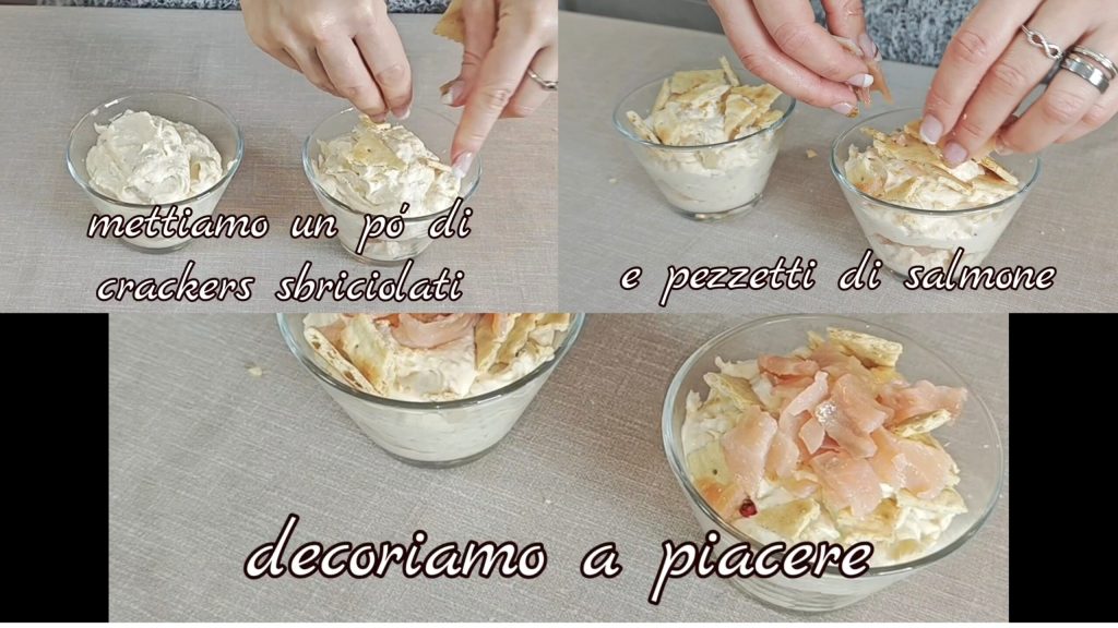 Émiettez un peu de crackers et terminez avec d’autres morceaux de saumon. Décorez à votre goût et mettez au réfrigérateur pendant quelques heures !