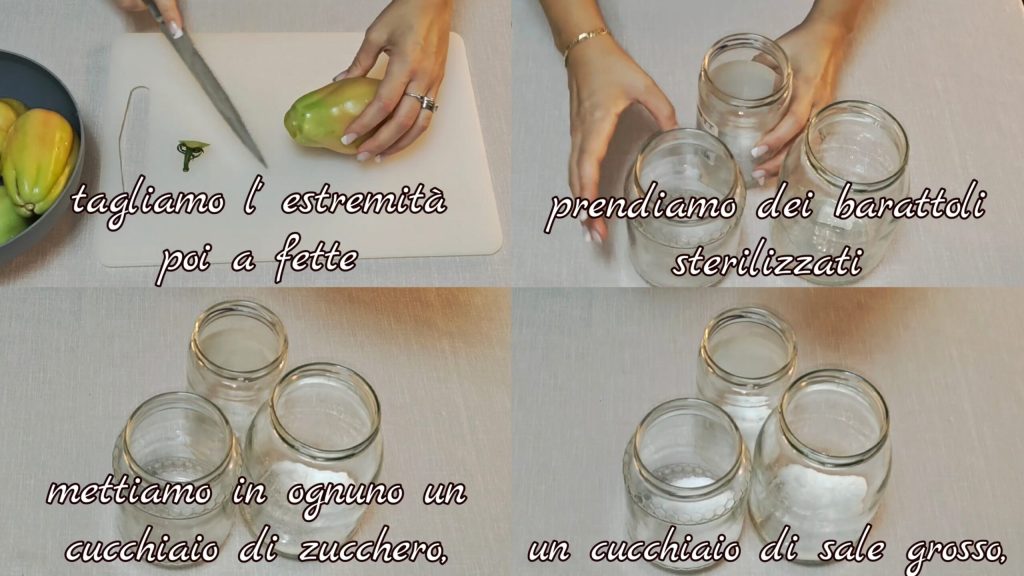 Laver puis nettoyer bien les tomates en coupant ensuite l’extrémité en tranches. Prenez des bocaux préalablement stérilisés et mettez dans chacun une cuillère de sucre, une cuillère de gros sel,