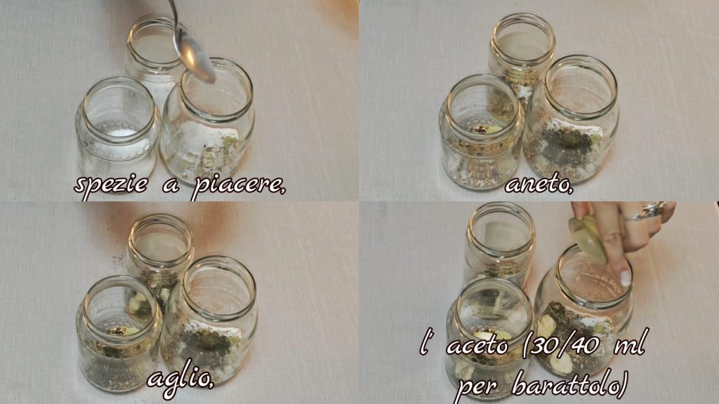 Ajouter des épices au goût, de l’aneth, de l’ail, du vinaigre (30/40 ml par bocal),