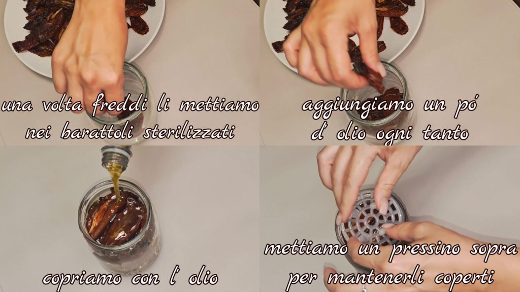 Une fois refroidies, nous les mettons dans des bocaux stérilisés. Nous ajoutons un peu d’huile entre les tomates et diverses épices à volonté. À la fin, nous les couvrons d’huile. Nous mettons un petit presseur dessus pour les garder couvertes. Nous fermons les bocaux et si nous voulons les conserver longtemps, nous faisons bouillir les bocaux pendant environ 20 minutes.