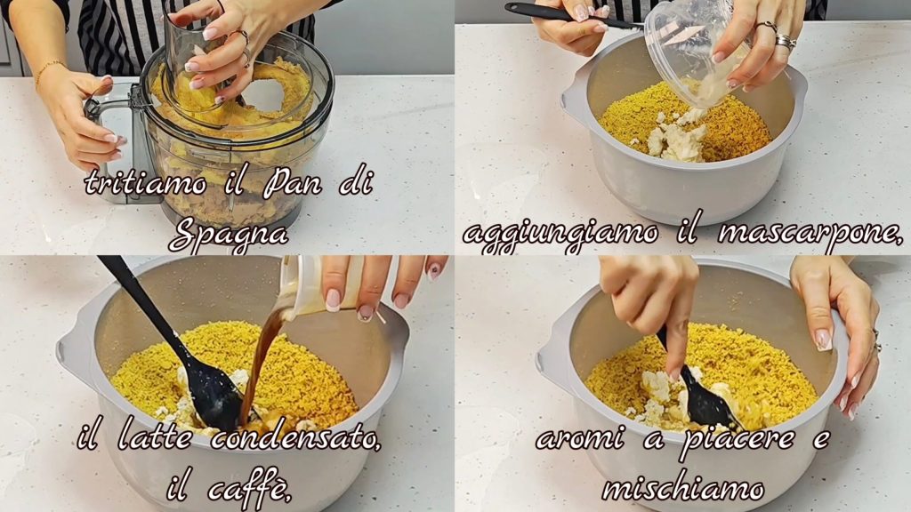 Tout d’abord, émiettez finement la génoise, ajoutez le mascarpone, le lait concentré, le café, les arômes à votre goût et mélangez bien jusqu’à obtenir une pâte homogène.