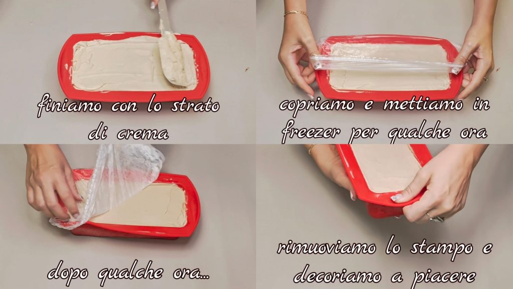 • Finissons avec la couche de crème, égalisons bien, couvrons et mettons au congélateur pour quelques heures. Ensuite, retirons le moule et décorons à notre goût.