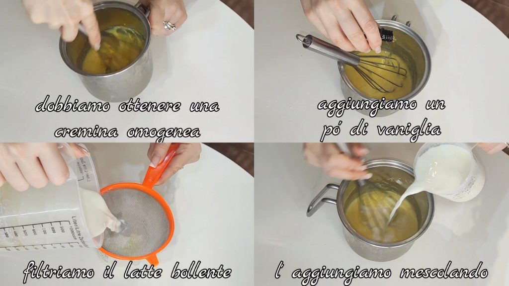 Nous devons obtenir une crème homogène. Ajoutez un peu de vanille. Filtrez le lait bouillant et ajoutez-le en mélangeant.