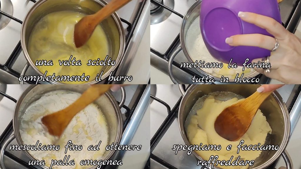 Une fois le beurre complètement fondu, ajoutez la farine d’un seul coup et mélangez jusqu’à obtenir une boule homogène. Éteignez et laissez refroidir.