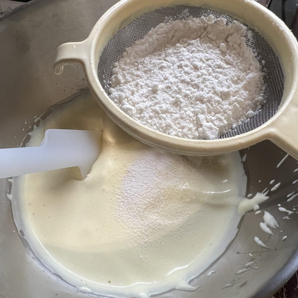 • Tamisez la farine dans le mélange en remuant délicatement avec une spatule, en effectuant des mouvements de bas en haut