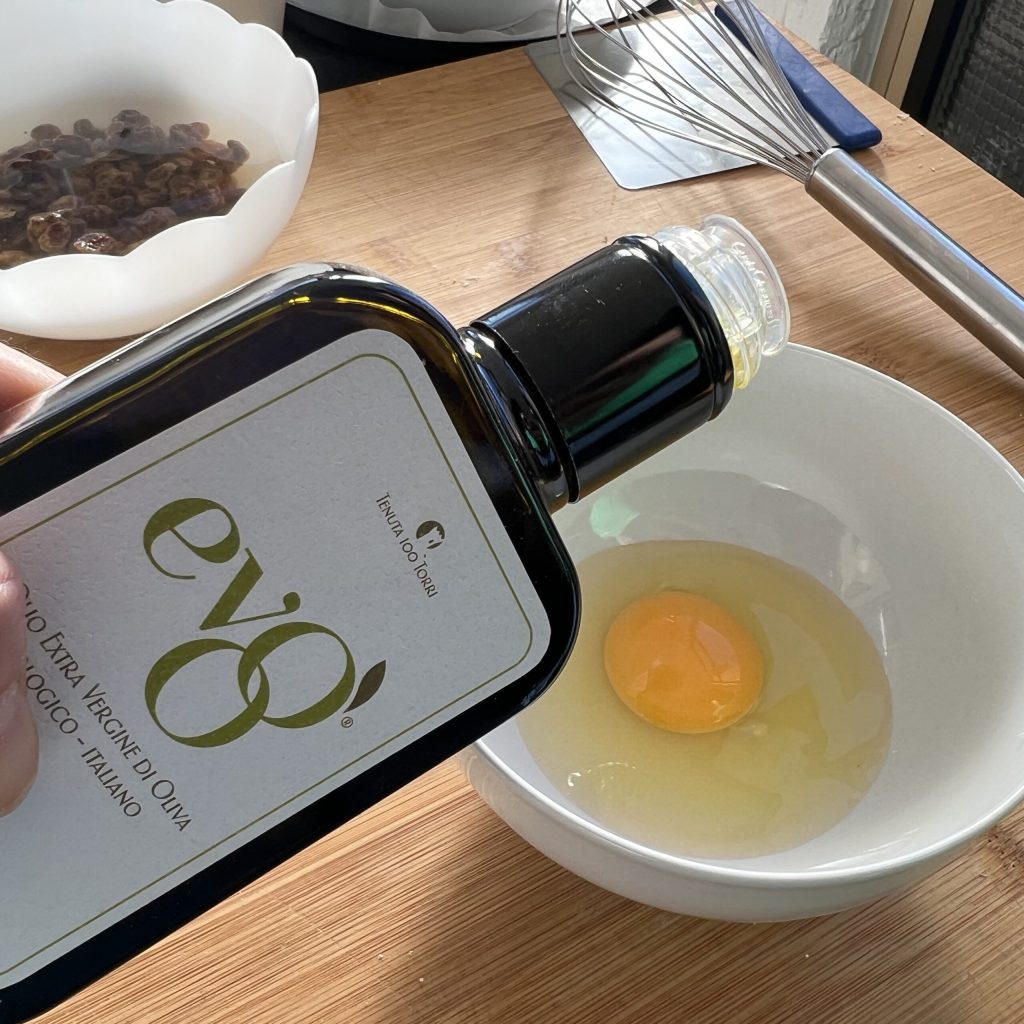 Dans un autre bol, mettez l’œuf entier et commencez à verser l’huile d’olive extra-vierge en filet